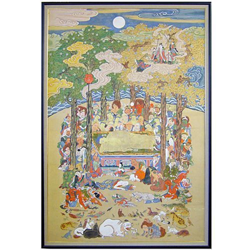 古い掛け軸に描かれた涅槃図を、額縁に飾り換えました。古い掛け軸でしたが本紙の状態は比較的良好で、お湯洗いと若干の補修を経てより美しくなりました。
