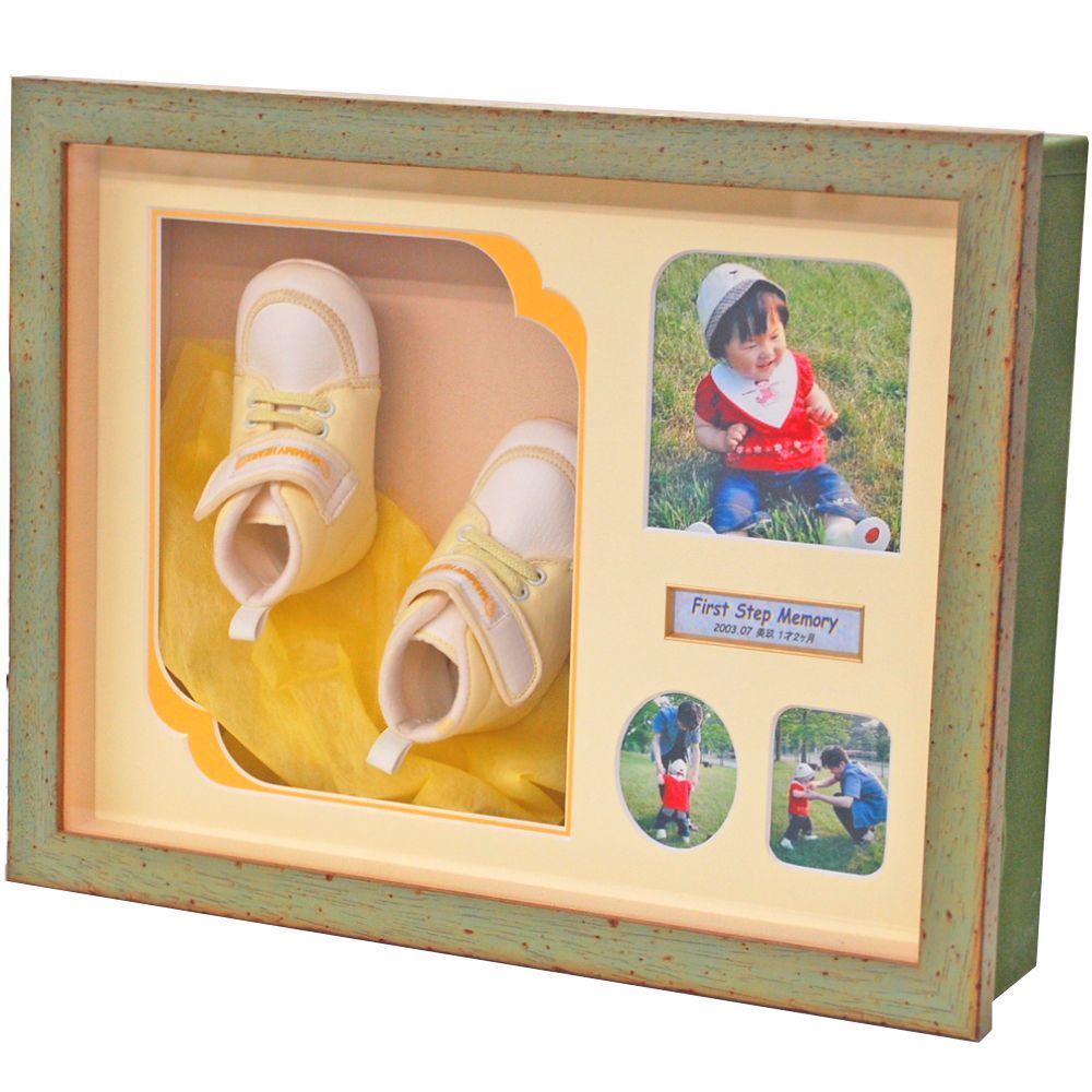 まだ小さかったお子さんの、はじめて一歩を踏み出した時の記念の靴と写真です。子どもの成長は本当に早いもの。ファーストステップは忘れずに飾っておきたいものです。