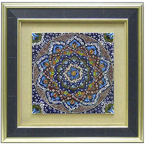 陶板のタイルをオーダーで額に入れました。ヨーロッパから持ち帰ったタイルです。旅先で見つけ、その美しさに重いのも忘れて求めたものだそうです。まるで万華鏡のような美しい模様に惹きこまれます。