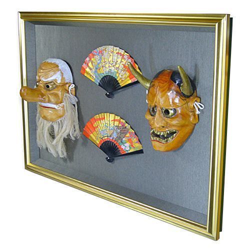 こちらはお客様のご希望で、表面のガラスなしで額装しています。能面の質感や色・艶、髭のくせや顔の凹凸の細部まで、直接的に鑑賞することができます。間近で見ても固定している部分が目立たないよう、固定方法を工夫しました。