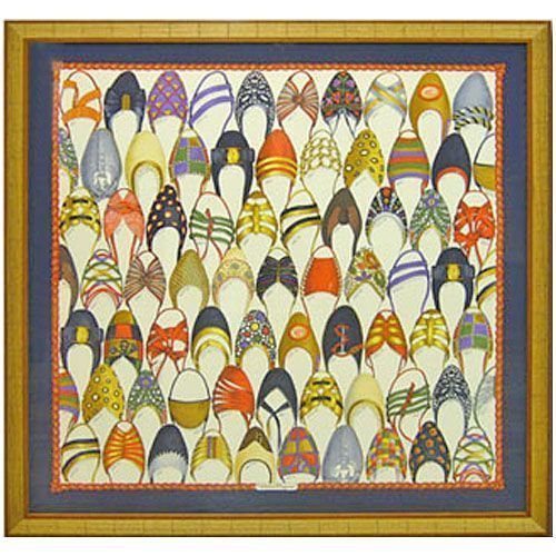 無数のサンダルが描かれた、インパクトのあるスカーフです。こういったデザインのスカーフは、巻いて使ったときにもカラフルな色合いが楽しめそうです。全体をピシッと伸ばせば、やはり多くのサンダルに目を奪われてしまいます。