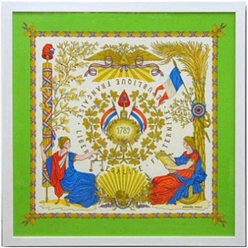 ブランドスカーフ つや消し白のフレームで鮮やかなグリーンのスカーフを額装