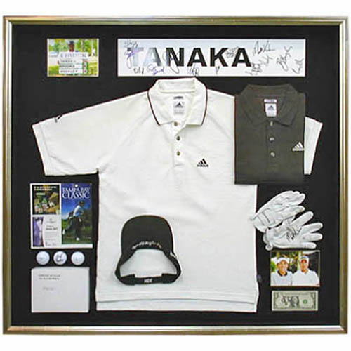 ゴルフの田中秀道プロのウェア等をオーダーの額縁に入れました。田中プロが実際に着用したシャツなどを関連グッズとともに額に入れています。お店に飾ってお客様にご覧いただくそうです。グローブやサンバイザー、写真等盛りだくさんで田中プロの全てがわかりそうな額装になりました。