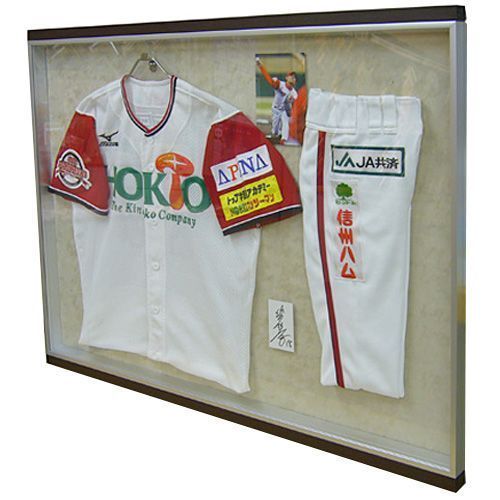 ユニフォーム上下に加え、写真とサインも一緒に飾りました。ユニフォームの上下を飾ると、どうしても額縁内に空白のスペースが生まれがちです。関連の品物を配置すれば、スペースの有効活用とより良い仕上がりを両立できます。