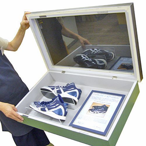 イチロー選手のシューズをオーダーで額に入れました。シューズは扉を開けて取り出すことができます。