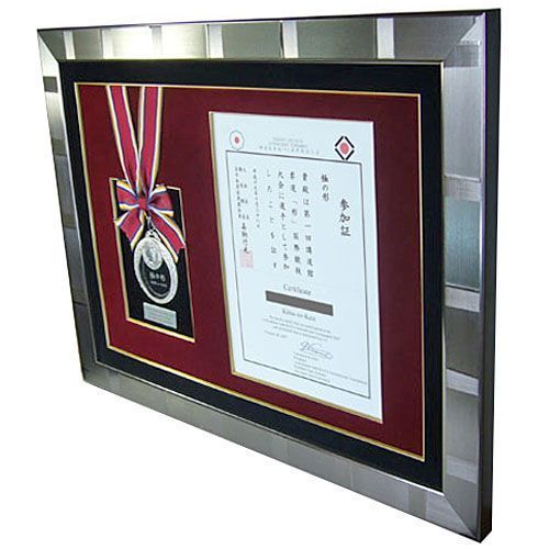 柔道大会での参加証と記念のメダル、フレームとマットの布とのカラーが良くコーディネートされ、お客様からお褒めいただきました。ずっと飾っていても色褪せない、上品な額になりました。