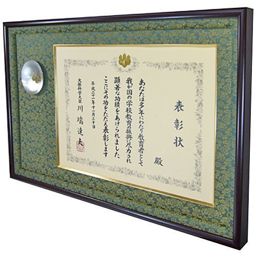 大臣表彰の表彰状と銀杯をオーダー額に入れました。教育振興で大臣表彰を受賞されたお客様、永年のお勤め本当にごくろうさまでした。
