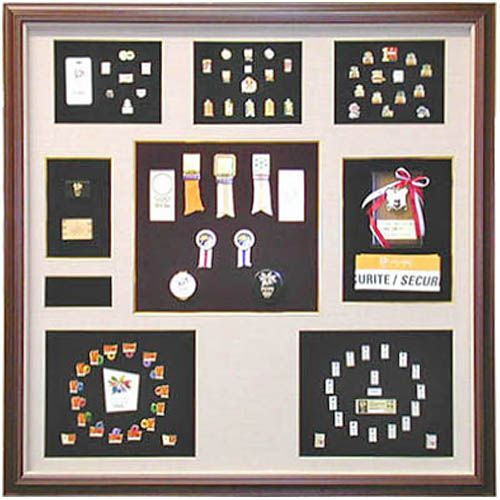 ピンバッジ専用のオリジナル額縁をご用意しておりますのでこちらをご覧ください。既製の額縁に、背景となるマットを組み合わせた商品になります。 フルオーダーで額縁をお作りすることも可能ですのでお気軽にお問い合わせください。