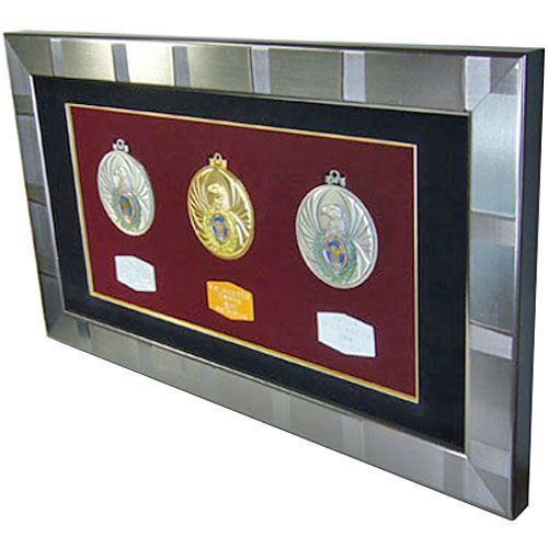 メダル裏面のプレートも合わせて、メダル3種を額装しました