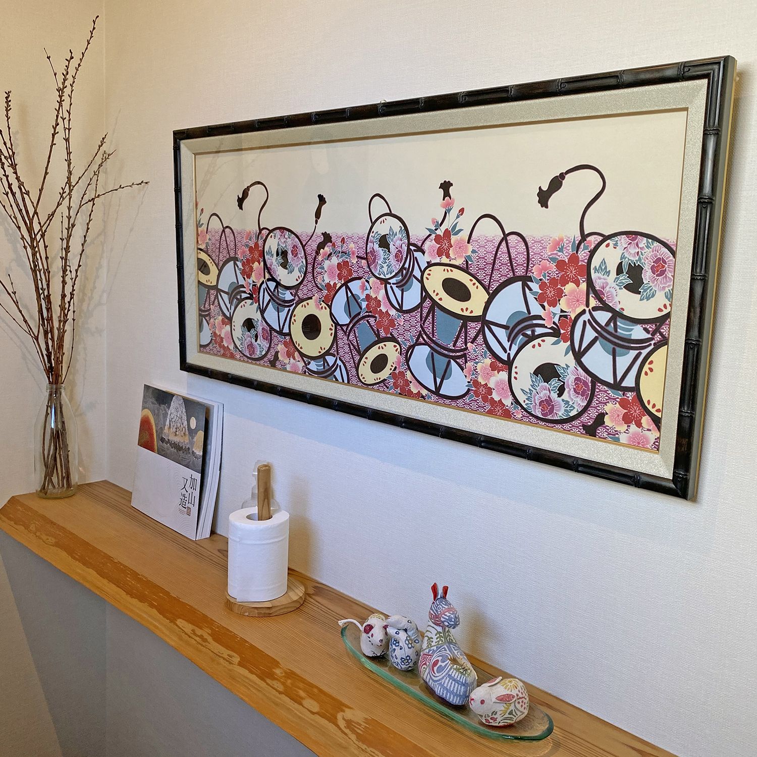 手ぬぐいのスペシャル額装です。手ぬぐいはサイズぴったりの額縁でシンプルに飾ることが多いですが、高さのあるマット材を組み合わせて奥行きのある額装に仕上げました。