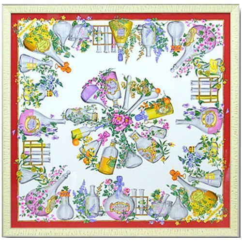 香水ビンでしょうか、色取り取りのビンが描かれたスカーフです。スカーフ回りの赤に合わせてホワイトのフレームを選択しました。