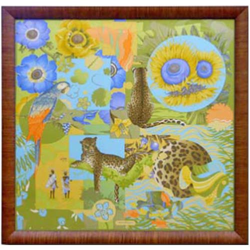 木肌模様を強調した木製フレームで、スカーフの額縁を製作
