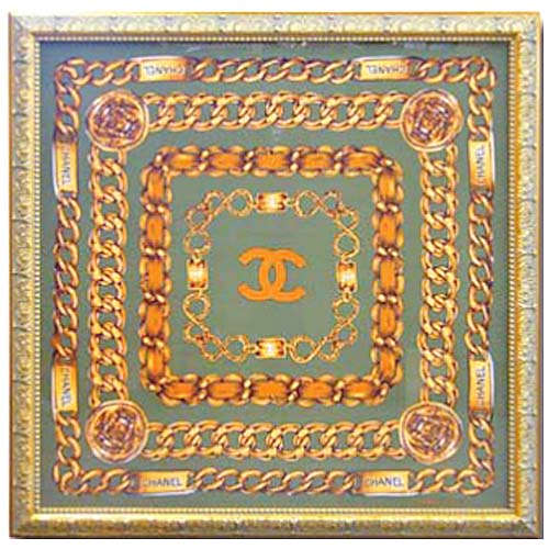 金のチェーンというスカーフのテーマにぴったりの、豪華な額縁で額装しました。