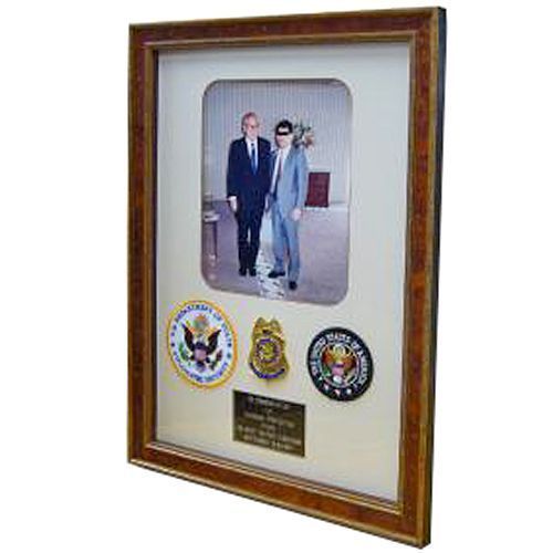 アメリカの元大統領補佐官キッシンジャー氏のボディガードを務めた記念の写真とバッジです。バッジだけでなく写真も一緒に額装することで長年経っても思い出が色褪せない額となるのでオススメです。マットの窓の形も、お客様のお好みに様々な切り口が可能です。
