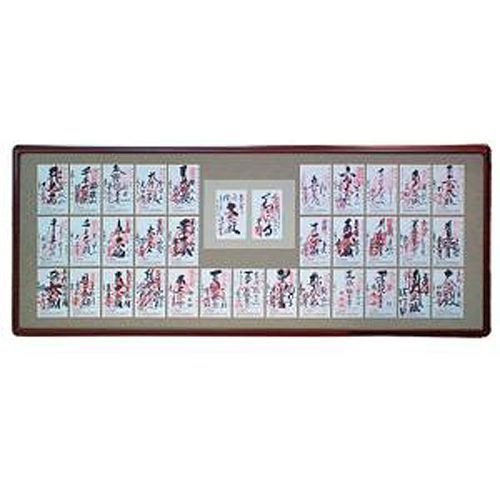 三十三観音霊場納経札をオーダーフレームで額装しました。中央には善光寺と北向堂のお札を配置してあります。飾る場所に制限があり、その寸法に合わせて額縁をお作りしました。