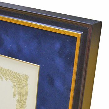 A4サイズの賞状額は、それこそ星の数ほどの既製品があります。こちらの額装例ではオーダー製作した額縁を使いましたが、一般額の太子サイズを利用して飾るのもおすすめ。A4用紙の周りに5cm程度のマットが付く、理想的なサイズバランスで額装できます。