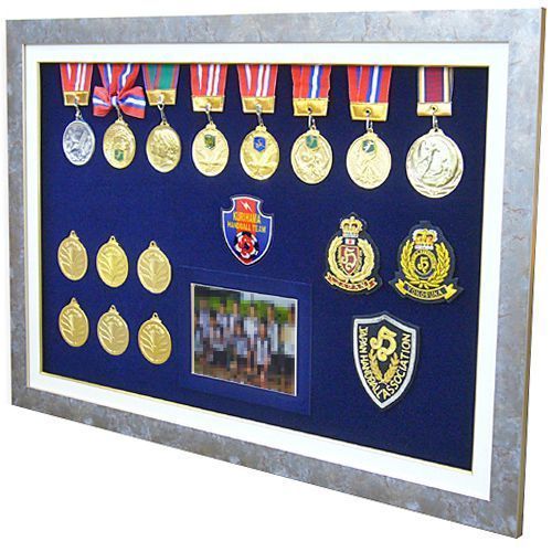 自衛隊ハンドボール部での獲得メダルとエンブレム等をオーダーで額に入れました。伝統が伝わる一品です。