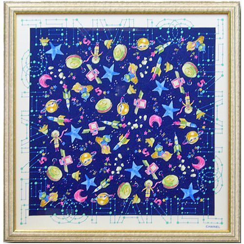 星座をモチーフにした小さ目のスカーフを額装しました。夜空の外側にも星が描かれて、シャネルのロゴを映し出しています。
