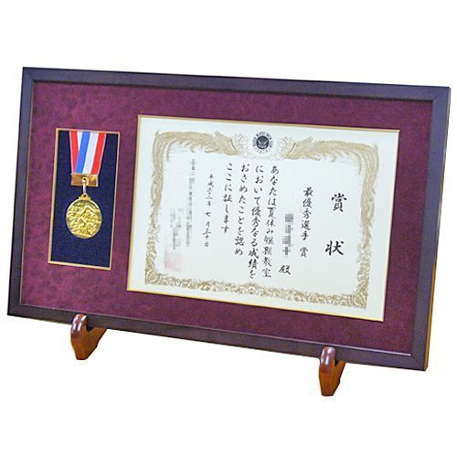 水泳教室最優秀選手の賞状と金メダルをオーダーで額装しました。シンプルな形状のフレームとスウェード調マットが高級感を演出しています。メダルは埋め込み加工をしているため、ずり落ちる心配はございません。安心して飾ることが出来るのもオーダーで額を作るポイントです。メダルの額装は、基本的に品物を当店でお預かりし、完璧に仕上げてからご返送しております。豊富なノウハウを誇る当社の技術をお確かめください。