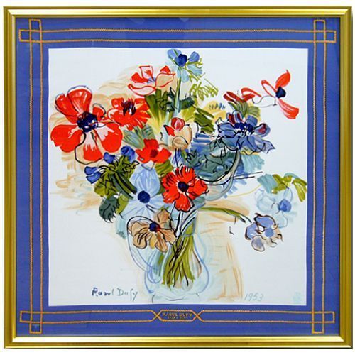 20世紀のパリを代表するフランス近代絵画家、ラウル・デュフィの絵画をモチーフに製作されたスカーフです。箔張りの上品な金色のフレームで額装しました。 デュフィ絵画の特徴である、透明感のある色彩が楽しめるスカーフ。『色彩の魔術師』とも呼ばれるデュフィらしい作品です。