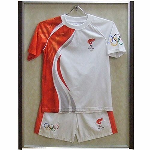 こちらは既製ユニフォーム額縁『P114』を使用しております。 日本人として北京五輪の聖火ランナーを務めたのはこの方だけだそうで、非常に貴重な品物です。シャツは付属のハンガーに掛け、パンツはバックボードに数箇所縫い付けて固定してあります。たわんだり浮いたりする心配なく飾ることが出来るのは、経験豊富な当店に額装をお任せいただく大きなメリット。基本的にユニフォームの額装はお客様自身の手で可能かと思いますが、額装をご希望の場合はご相談ください。