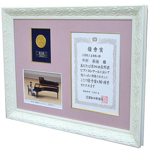 ピアノコンクールで優秀賞を受賞した時の記念の賞状とメダル、演奏している写真を一緒にオーダーで額に収めました。