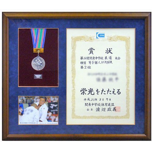 関東中学校柔道大会での賞状と銀メダル、試合している写真を一緒にオーダーで額に収めました。写真を一緒に額に入れると、その時の臨場感や思い出がより鮮やかに残るのでおすすめです。イメージどおりの額装にご満足いただきました。