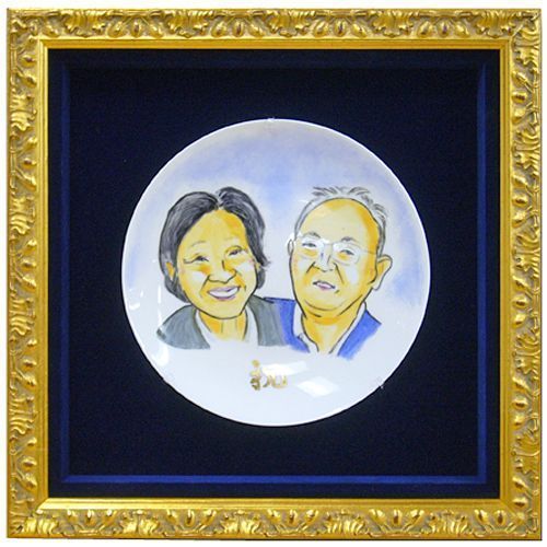 似顔絵の絵皿をオーダー額に。仲睦まじく微笑んでいる似顔絵が印象的な絵皿です。ゴールドの額に入れて華やかに仕上げました。