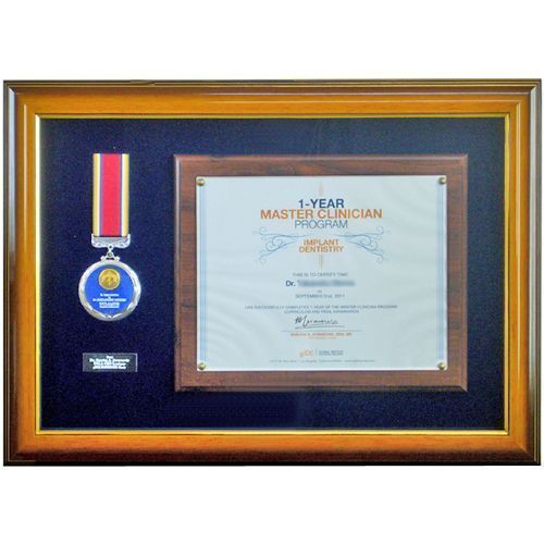 終了証は木製台とアクリルに挟み込まれた立派な品です。いわゆる盾型で、額縁に入れなくてもそのまま飾れる品物でしたが、あえてメダルと一緒に額装することでさらに格調高くなりました。盾状の証書のままだと、メダルを横に飾るしかセットで鑑賞する方法がありません。思い切って額装してみるのも良いでしょう。