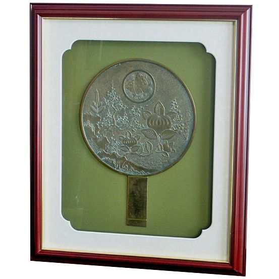 銅鏡を既製一般額を利用して額装しました。バックボードに布貼りし、中心に銅鏡を配置しました。固定方法はタコ糸で縛っています。