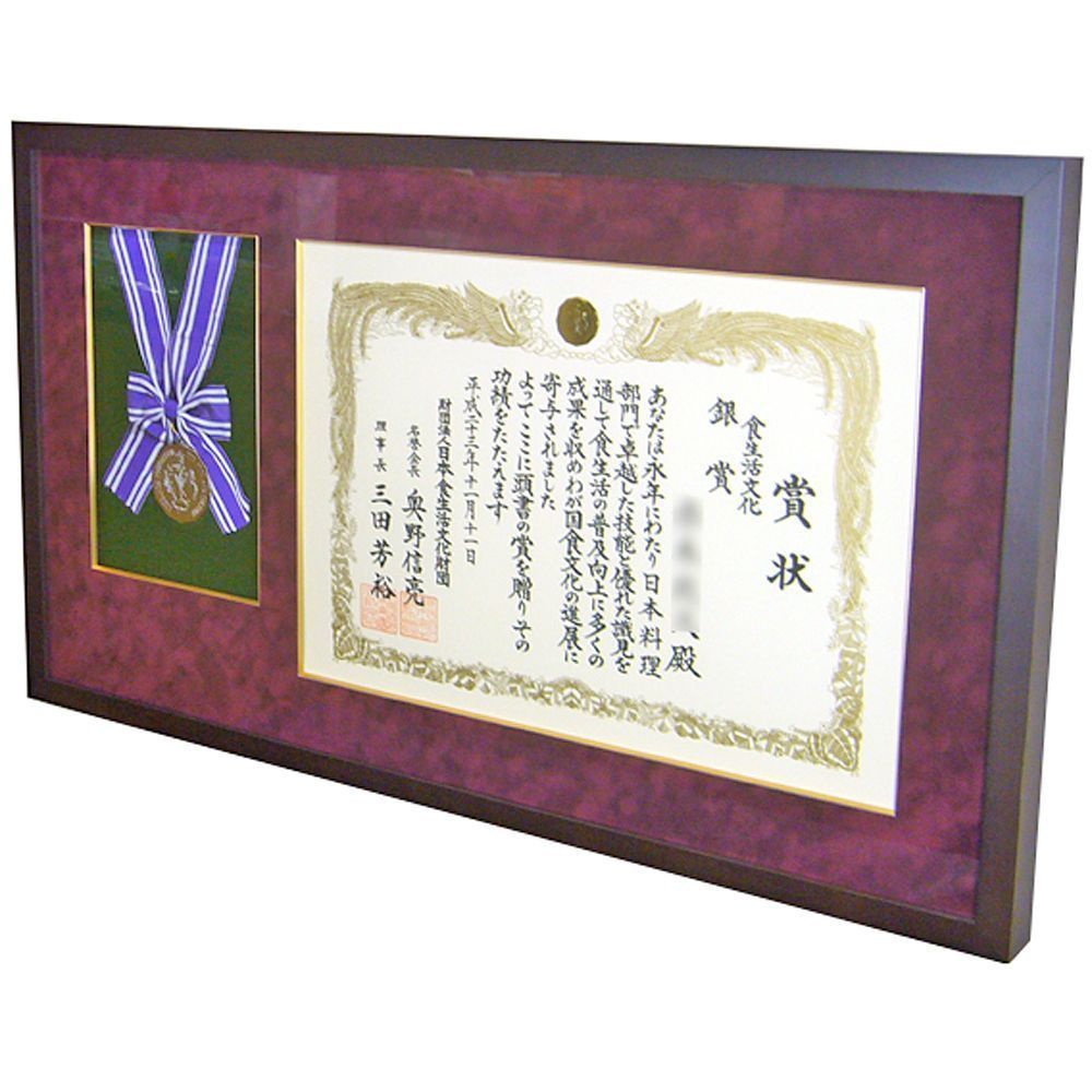 日本食生活文化財団の主催する料理コンテスト。日本料理部門で見事銀賞に輝いた記念の賞状と、メダルをオーダー額に入れました。