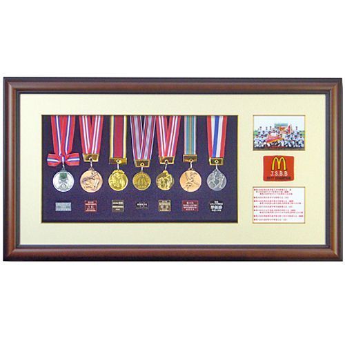 メダルは埋め込んであります。メダルの裏のプレートを剥がし、それぞれの下部に貼り付けました。メダル裏のプレートは、大会の日時などが書いてあります。額装するときにメダルは埋め込み、張り付けてしまうため裏面は見れません。可能ならばプレートを剥がして一緒に飾ると良いでしょう。