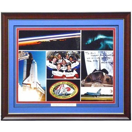 毛利衛・宇宙飛行士の記念品の額装です。想い出の画像をレイアウトしたお写真、サイン、ワッペンがあしらわれています。ワッペンに厚みがあるので、マットを2枚重ねのダブルマット仕様にしてアクリル面との空間を稼いでいます。