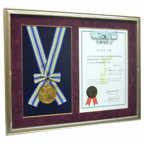 布貼り面金付きの額装マットと、彫りの入ったシルバーの額縁で賞状とメダルを額装しました。