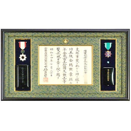 支那事変の功により賜った金鵄勲章と双光旭日勲章の額縁を注文製作しました。ケースも一緒に収めてあります。