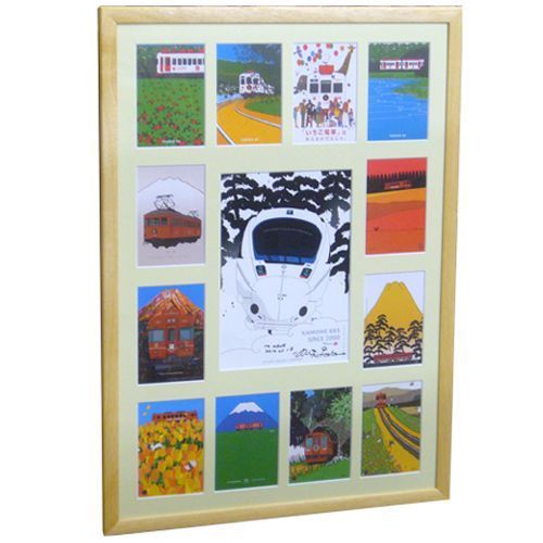 水戸岡鋭治展で求めたハガキセットと、A4サイズのパンフレットを額縁に入れました。マットには13ヶの複数窓抜きを施しています。