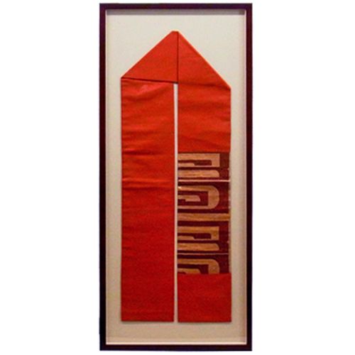 着物の帯地の額装。着物は古くなっても仕立て直しで形を変え、長く愛用されます。こうして額縁に入れ、インテリアとして楽しむのもおすすめです。勉強不足で詳しくは分からないのですが、こちらは着付けのときの帯のたたみ方を額の中で再現しているようです。