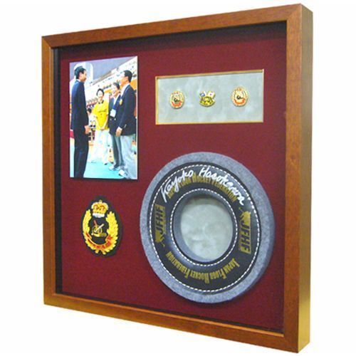 フロアホッケーのパックを中心に、フロアホッケー関連のピンズやエンブレム、写真をレイアウトして額に入れました。