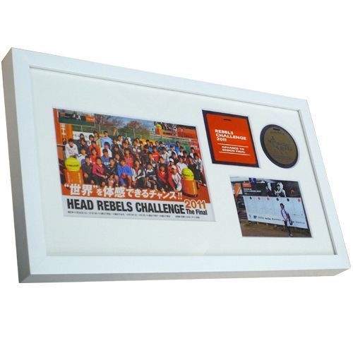 全国ジュニアテニスツアー、『HEAD REBELS CHALLENGE 2011』のお写真などをまとめて額縁に入れました。お写真以外の品物も、比較的薄くて軽いものでしたので、両面テープなどを駆使して額装しています。