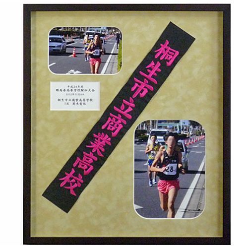 群馬県高等学校駅伝大会の、タスキと写真をオーダーで額に入れました。特上布マットをタスキを貼り付ける土台とし、空いたスペースには窓抜きを施して写真を飾っています。