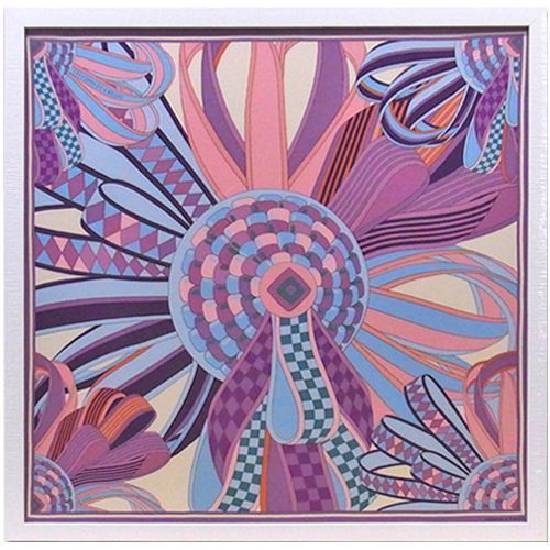 光沢のあるホワイトと、筋模様が特徴的なフレームで額装しました。フレームの白とスカーフの紫が対比され、とても美しい額装になりました。紫や青には、ホワイト、シルバーのフレームを合わせるのが基本です。カラーイメージが統一され、引き締まった額装に仕上がります。