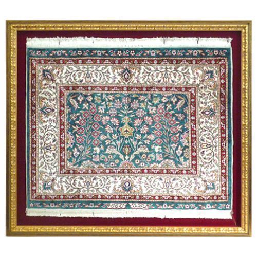 絨毯はそのまま壁にピンなどで飾ってしまう方もいらっしゃいますが、埃や日焼けから守られ、なによりインテリアとしての価値が格段に増すので額に入れることも考えてみてください。職人が作る手の込んだ絨毯はまさに芸術品。額縁に入れることは何の違和感もありません。