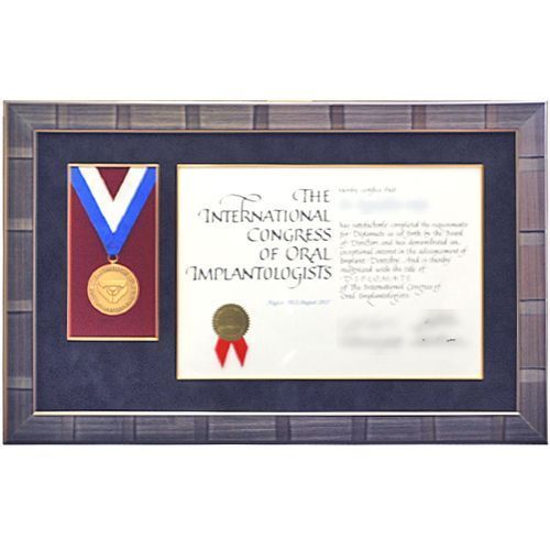 歯科インプラントの最新技術に関する国際インプラント協会の認定書とメダルです。