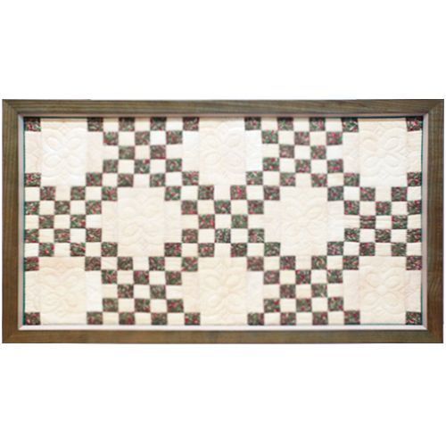 パッチワークの回りに余白をとって、作品の端まで楽しむ額装もできますが、いかんせん額縁が大きくなりすぎてしまいます。今回は作品ぴったりの額縁をお作りしました。小さめの作品なら、