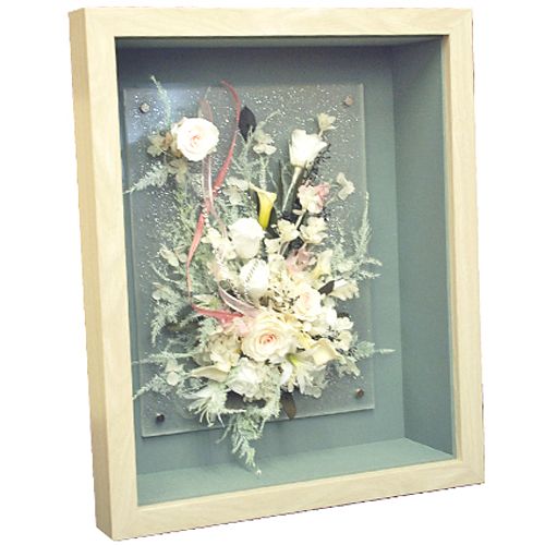 を土台とし、花をあしらった作品をそのまま額縁に入れました。額縁の深さを100ミリとし、作品の立体感を損なわないように額装しています。