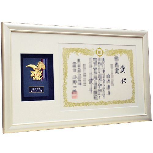 賞状と記念の盾をセットで額縁に入れました。パールホワイトのフレームにプレーンなホワイトのマットを合わせて、すっきりした額装に仕上げています。