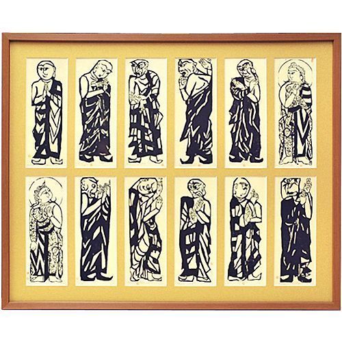 棟方志功の力強い版画作品、『釈迦十大弟子』。1956年ヴェネツィア・ヴィエンナーレで、仏画の極致とも称された棟方志功の代表的な作品です。本物の作品は1mにもなる大きな作品ですが、はがきの複製品が棟方志功記念館で販売されています。