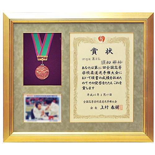 全国高等学校柔道選手権大会の記念品の額装です。賞状とメダル、記念のお写真も一緒に入れました。