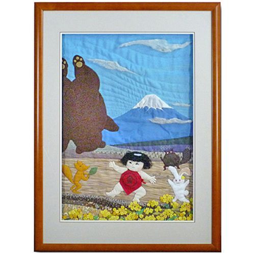 パッチワークで描かれた昔話・金太郎の一場面、作品の厚み、風合いが損なわれないよう深さに余裕のある額縁に入れました。コーナーアップのうさぎの右側に影ができていることからも、マットが作品に触れずに浮いていることがわかると思います。作品はマットの下でテープを使って固定されています。