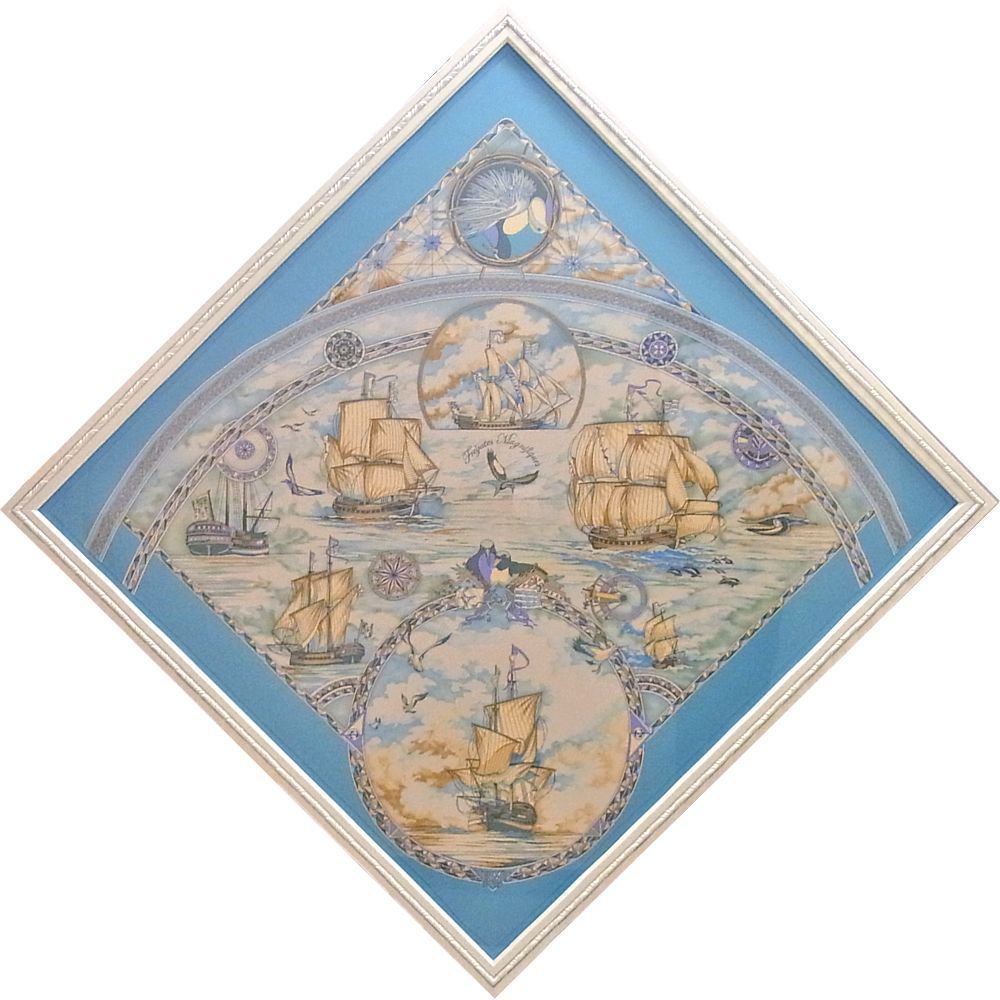 標準的な大きさのスカーフの額装ですが、斜めに掛けられるよう、吊金具の位置を工夫しました。普通の四角の向きに掛けられるようにもしてあります。